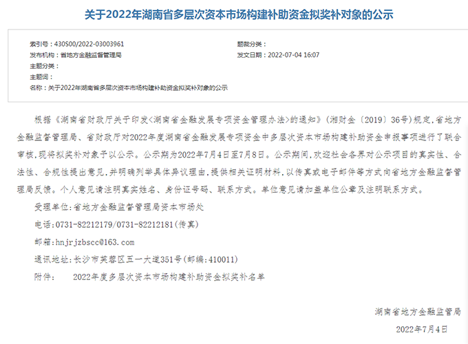 7月4日,湖南省地方金融監(jiān)督管理局正式公布了獲得2022年度湖南省金融發(fā)展專項資金中多層次資本市場構(gòu)建補助資金的名單,萬寶投資集團全資子公司湖南鏈城私募股權(quán)基金管理有限公司順利通過湖南省地方金融監(jiān)督管理局和湖南省財政廳的聯(lián)合審核,獲得了省級主管單位的認(rèn)可,名列其中,擬獲得補助資金75萬元,成為婁底市第一家榮獲湖南省金融專項發(fā)展資金補助的基金管理公司。