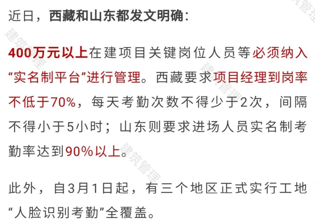(一)在工程建設(shè)過程中,項目經(jīng)理在崗履職時間不應(yīng)少于本月施工時間的70%,總監(jiān)理工程師在崗履職時間不應(yīng)少于本月施工時間的40%(當(dāng)月施工時間如無放假、請假及其他特殊原因的按照當(dāng)月日歷天數(shù)計算),建設(shè)單位關(guān)鍵崗位人員到崗率不應(yīng)低于30%,整個項目關(guān)鍵崗位人員綜合到崗率不應(yīng)低于60%。對于項目關(guān)鍵崗位人員到崗率不滿足要求的,“實名制平臺”將自動生成預(yù)警,各級住房和城鄉(xiāng)建設(shè)主管部門應(yīng)對相關(guān)項目列入“重點監(jiān)管對象”。建設(shè)單位、施工企業(yè)、監(jiān)理企業(yè)及其人員在人臉識別考勤中弄虛作假、偽造的,一經(jīng)發(fā)現(xiàn),按未到崗履職處理。