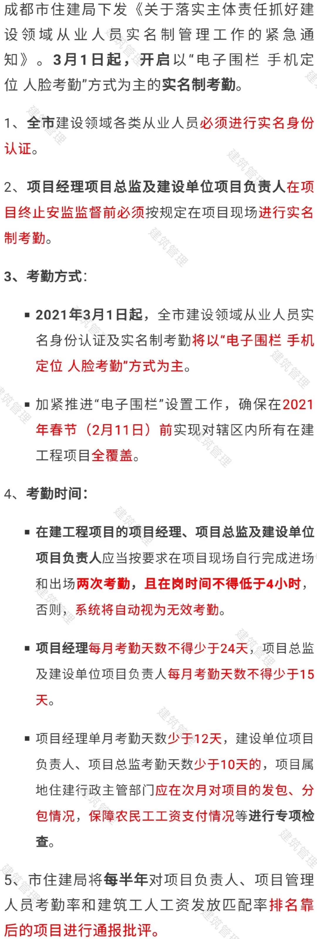 (三)建設(shè)單位負(fù)責(zé)組織對建設(shè)、施工、監(jiān)理的項目關(guān)鍵崗位人員實施考勤管理,總承包單位負(fù)責(zé)對分包單位人員實施考勤管理。施工總承包單位將專業(yè)工程分包的,分包單位現(xiàn)場負(fù)責(zé)人員和安全管理人員一并納入考勤。